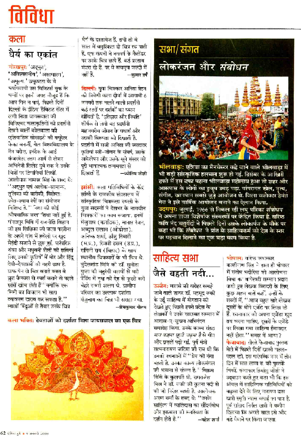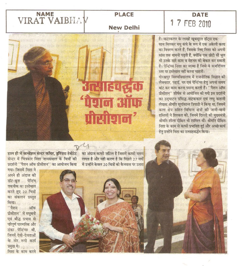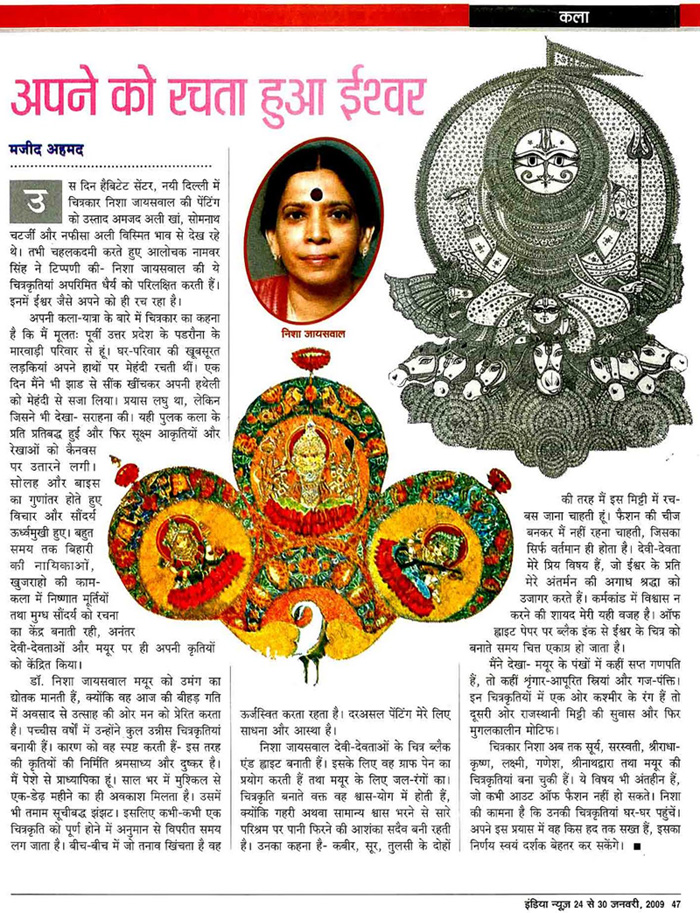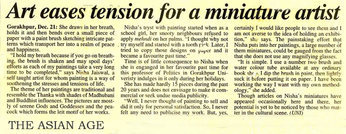 STUNNING DEPICTION: Myriad Hindu Gods in Black and White Nisha Jaiswal presents 'Miniature Masterpieces', an exhibition of her work of two decades. The peacock is her solitary motif in colour where she uses striking colour representations.Nisha uses a self-developed technique of dot-brush painting for her creations. A purist, Nisha does not compromise on quality for the sake of quantity, producing about two paintings a year. The Statesman, New Delhi, 14 December 2007. |
